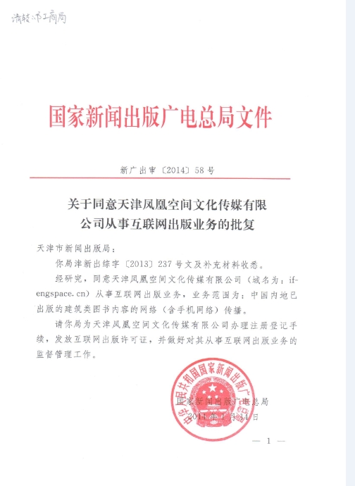 2014年1月14日,經(jīng)國家新聞出版廣電總局、天津新聞出版局研究,同意天津鳳凰空間文化傳媒有限公司(域名為:ifengspace.cn)從事互聯(lián)網(wǎng)出版業(yè)務(wù),業(yè)務(wù)范圍為:中國內(nèi)地已出版的建筑類圖書內(nèi)容的網(wǎng)絡(luò)(含手機網(wǎng)絡(luò))傳播。