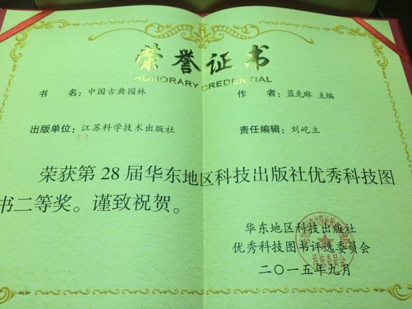 《中國古典園林》榮獲第28屆華東地區(qū)科技出版社優(yōu)秀科技圖書二等獎