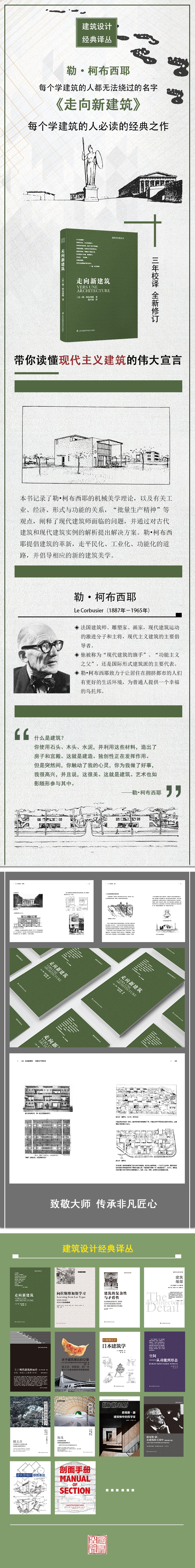 全世界建筑專業(yè)人士人手一冊(cè)的經(jīng)典之作。歷時(shí)三年,經(jīng)過(guò)反復(fù)地翻譯、校譯、審校,《走向新建筑》最新版終于得以出版,這本書(shū)更是對(duì)永遠(yuǎn)的建筑大師——勒?柯布西耶的致敬。每一位建筑專業(yè)的學(xué)生都應(yīng)該讀一下它。