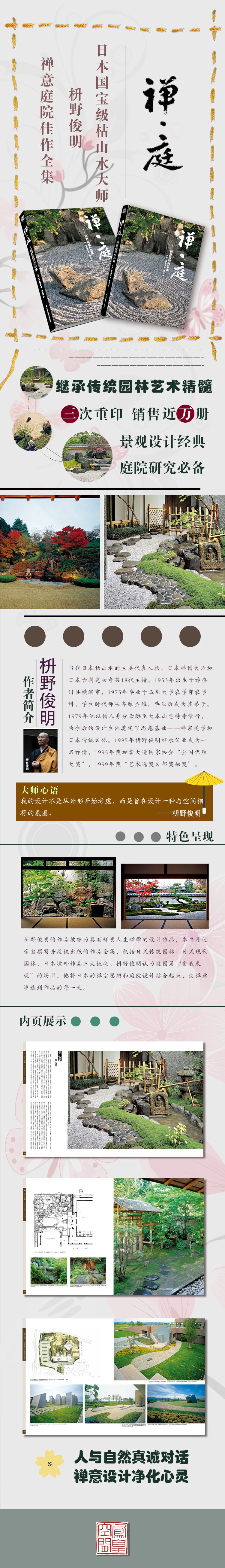 擁有三十多年景觀設(shè)計(jì)經(jīng)驗(yàn)的枡野俊明,現(xiàn)任日本造園設(shè)計(jì)事務(wù)所總設(shè)計(jì)師,他的作品遍及世界多國(guó)。1995年他因主持加拿大新渡戶庭園改造設(shè)計(jì)工程榮獲加拿大造園家協(xié)會(huì)“國(guó)際大獎(jiǎng)”。作為枡野俊明先生親自撰寫并唯一授權(quán)國(guó)內(nèi)出版的作品全集,《禪?庭——枡野俊明作品集》收錄了大師的全部作品,深入介紹了每個(gè)作品的設(shè)計(jì)手法和理念,不容錯(cuò)過。