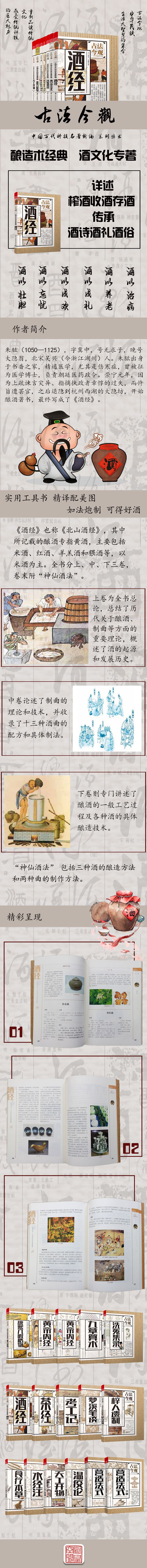 宋代朱肱所著的《酒經(jīng)》是宋代酒文化的經(jīng)典之作,書(shū)中既有對(duì)中國(guó)酒文化的高度概括和論述,同時(shí)又提供了具體的制曲、釀酒方法以及如何榨酒、收酒、貯存酒,是我國(guó)現(xiàn)存的第一部全面系統(tǒng)論述制曲釀酒工藝的專門(mén)著作。全書(shū)分上、中、下三卷。上卷為總論,論酒的發(fā)展歷史;中卷論制曲,收錄了十三種酒曲的配方及制法;下卷著重論述釀酒的工藝過(guò)程及各種酒的釀造技術(shù)。并提供相關(guān)附錄鑒賞,包括序跋如讀朱翼中《北山酒經(jīng)》并序、《北山酒經(jīng)》跋.、《北山酒經(jīng)》跋等,及相關(guān)酒文化知識(shí),如酒的歷史.、酒的起源、酒名、酒類、酒具、酒禮、酒俗、酒文學(xué)、酒與詩(shī)人、酒與書(shū)畫(huà)、酒令、酒市等,是對(duì)中國(guó)傳統(tǒng)文化的總結(jié),是為對(duì)酒文化、傳統(tǒng)文化感興趣的讀者準(zhǔn)備的一場(chǎng)盛宴。