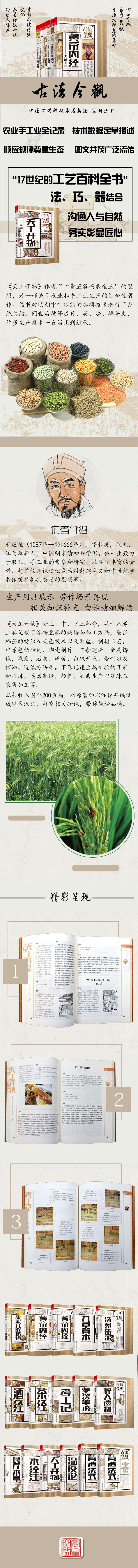 本書采用圖文并茂的形式,為今天的讀者閱覽輝煌燦爛、博大精深的國(guó)學(xué)文化提供一條捷徑,引領(lǐng)讀者走進(jìn)一片源遠(yuǎn)流長(zhǎng)、光輝燦爛的文化天地,讓讀者感受到中國(guó)古代科技的力量與理趣,而將原著編譯成了現(xiàn)代漢語(yǔ)并加以注釋,進(jìn)一步拉近了遙遠(yuǎn)文化與現(xiàn)代人的距離。值得一提的是,本書收入圖畫200 余幅,既生動(dòng)地展示了古代生產(chǎn)用具和生產(chǎn)場(chǎng)景,又體現(xiàn)了高超的農(nóng)業(yè)和手工業(yè)技術(shù),讓人嘆為觀止。有些圖片,展示的實(shí)物在現(xiàn)實(shí)中已經(jīng)很難一見了,所以特別珍貴。
