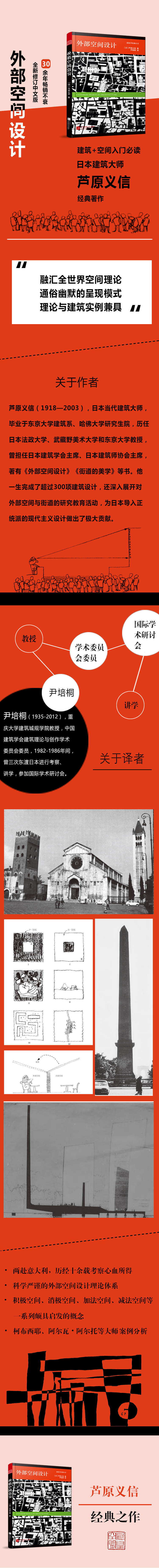 《外部空間的設(shè)計》是日本著名建筑師蘆原義信的作品。蘆原義信1942年畢業(yè)于東京大學(xué),曾任東京大學(xué)教授,并開設(shè)有蘆原義信建筑研究所。他曾主持設(shè)計了1967年蒙特利爾國際博覽會日本館、駒澤公園奧林匹克體育館等建筑。1960年起,他即開始研究外部空間問題,為此曾兩度到意大利考察。作者在書中通過對比,分析意大利和日本的外部空間,提出了積極空間、消極空間、加法空間、減法空間等一系列饒有興味的概念;并結(jié)合建筑實例,對庭園、廣場等外部空間的設(shè)計提出了一些獨到的見解。