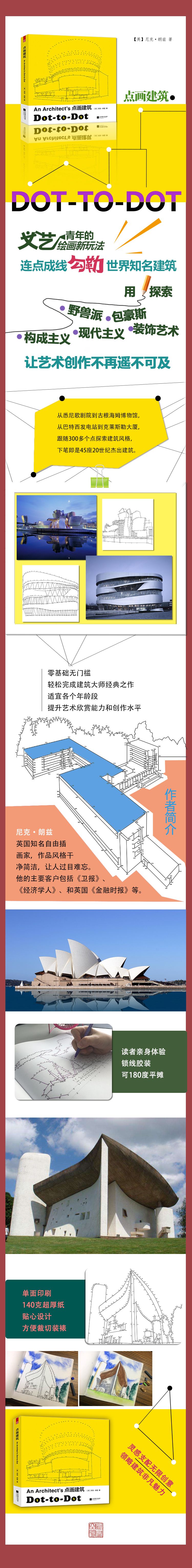 本書由英國著名插畫家尼克·朗茲精心打造,讓你用自己的雙手完成點(diǎn)到點(diǎn)的連接,這簡單的動(dòng)作便可讓你完成一幅創(chuàng)意作品——一張建筑大師經(jīng)典建筑的輪廓圖。45副精心挑選并設(shè)計(jì)的圖畫待您完成,每幅畫有300多個(gè)點(diǎn),簡單且易上手。這些大師的知名建筑包括賴特的流水別墅、柯布西耶的朗香教堂、約恩·烏松的悉尼歌劇院和扎哈·哈迪德的菲諾科學(xué)中心等,帶你游覽世界各地的知名建筑。