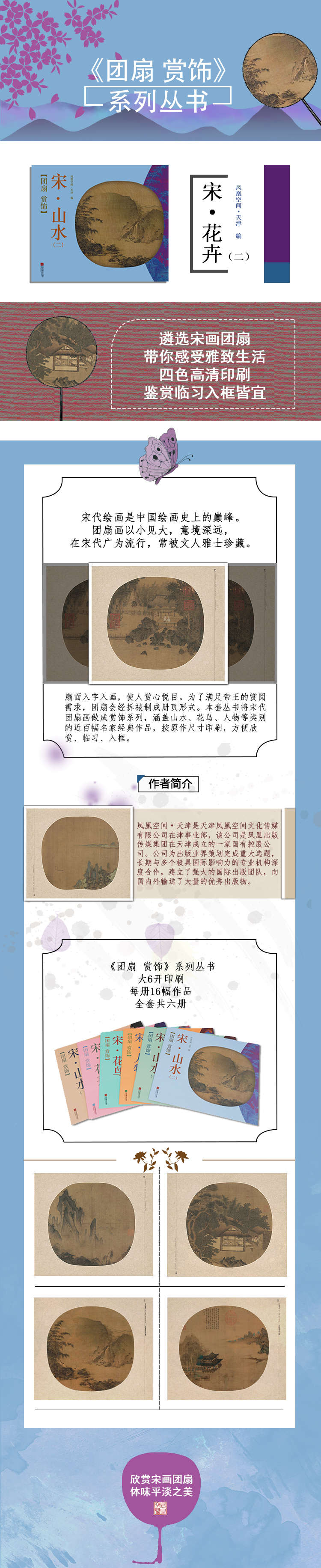 中國(guó)宋朝延續(xù)三百多年,民間繪畫(huà)、宮廷繪畫(huà)、士大夫繪畫(huà)各自形成體系,彼此間又相互影響、吸收、滲透,構(gòu)成宋代繪畫(huà)豐富多彩的面貌。本系類(lèi)叢書(shū)將宋代團(tuán)扇畫(huà)做成賞飾系列,涵蓋山水、花鳥(niǎo)、人物等各類(lèi)別,包括上百幅經(jīng)典作品,原作尺寸、高清印刷,供廣大讀者及愛(ài)好者欣賞、臨習(xí),亦可直接入框做裝飾用。如宋朝文人一樣,心中有山水,有一片屬于自己的山水。