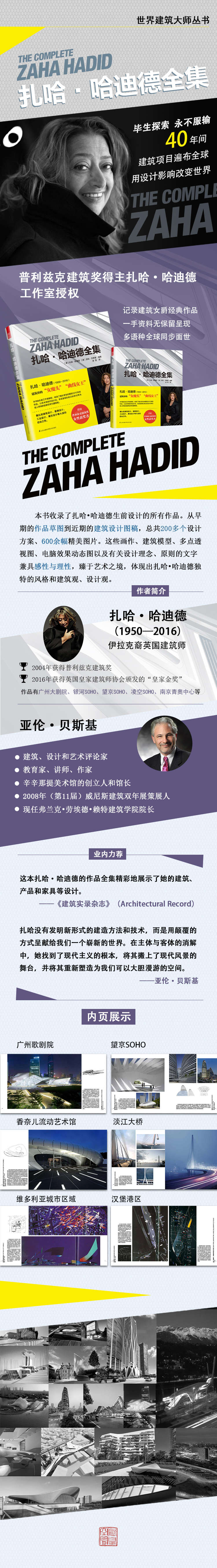 本書收錄了歷史上一位獲得普利茲克建筑獎(jiǎng)的女建筑師——扎哈·哈迪德生前所設(shè)計(jì)的所有作品。這些作品體現(xiàn)出了如其人的風(fēng)格,表現(xiàn)強(qiáng)烈,感性與理性兼具,并以流暢的線條取代傳統(tǒng)建筑的幾何架構(gòu)。書中收納了她從早期的作品、草圖到近期的建筑設(shè)計(jì)圖稿,總計(jì)200多個(gè)設(shè)計(jì)方案、600余張精美圖片,其中包含巨幅畫作、建筑模型、多點(diǎn)透視圖以及電腦效果動(dòng)態(tài)圖等等。