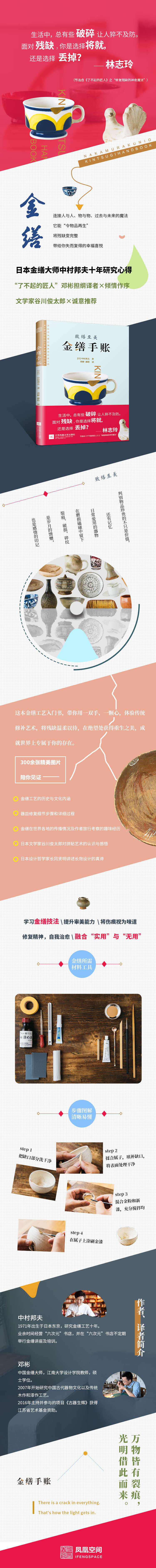 《金繕手賬》不只是一本學(xué)習(xí)金繕工藝的入門級手工書,還是一本心靈修復(fù)的休閑讀物。本書介紹了金繕工藝的歷史與文化內(nèi)涵及其在世界各地的分布與發(fā)展,隆重邀請日本著名文學(xué)家谷川俊太郎分享他對拼貼藝術(shù)的認(rèn)識與感悟,與日本設(shè)計(jì)哲學(xué)家長岡賢明探討長效設(shè)計(jì)的真諦,讓讀者在輕松學(xué)習(xí)修繕瓷器的技法的同時(shí),還可以提升讀者的藝術(shù)鑒賞與審美能力。