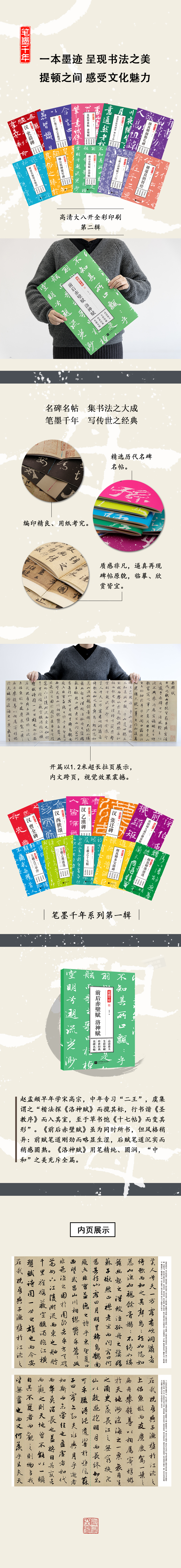 1、本套碑帖內(nèi)文精心設計,含全彩1.2米超長拉頁,用心為讀者呈現(xiàn)更震撼的視覺盛宴,感受更多豐富細節(jié)。