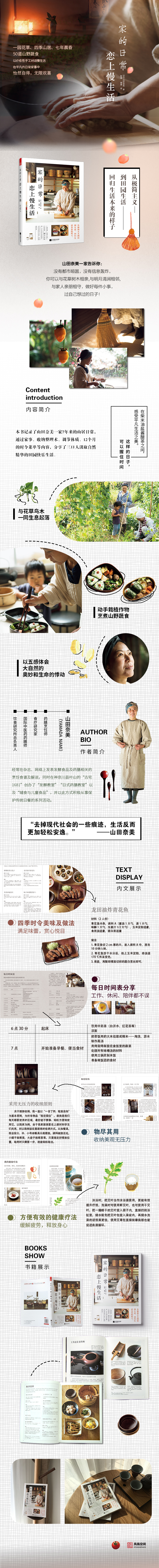 《家的日常 戀上慢生活》記錄了作者山田奈美7年來的山居生活的日常。作者一家三口怡然自得于山居田園生活,與花草鳥木一同生息起落,動(dòng)手栽植作物、烹煮山野蔬食,并與大地苔蘚蕨共舞,在凡間俗世里尋求生命的悸動(dòng)……本書作者以深邃的心靈感應(yīng),帶領(lǐng)讀者走入一方綠林盎然的天地,以經(jīng)年深居山林的心得,分享其純粹的步調(diào),不論幽徑散步、養(yǎng)生蔬食及手工之作,皆以五感傾聽大自然奧妙的悅音。