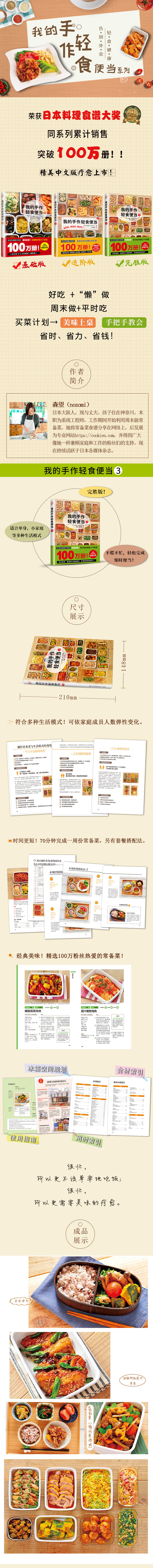 《我的手作輕食便當(dāng)3》為輕食便當(dāng)系列第三部。作者著手常備菜制作已有8年的時(shí)間,期間歷經(jīng)就業(yè)、結(jié)婚與生子,,但是不管生活中發(fā)生多大的變化,常備菜都依然是日常生活中不可或缺的一部分,作者也對常備菜有了更多的生活感悟。本書以“符合多種生活模式的常備菜”為主題。以單身者、新婚夫妻或小家庭為單位,依家中人數(shù)彈性調(diào)整菜譜,甚至還有2周的常備菜套餐計(jì)劃,更大幅降低準(zhǔn)備時(shí)間,更附上百萬粉絲精選的人氣菜譜!