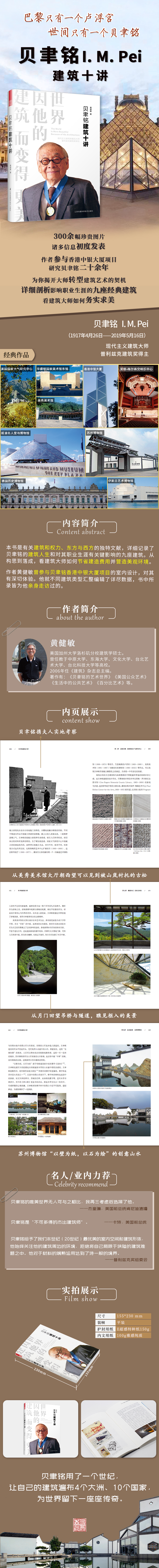 作者黃健敏追蹤建筑大師貝聿銘的建筑人生,收錄的九座建筑皆為他親身走訪過的,如香港中銀大廈、桃源鄉(xiāng)記——美秀美術(shù)館、蘇州博物館等膾炙人口的經(jīng)典之作。全書十萬余字,圖片三百余幅,諸多信息為首度發(fā)表。這是一本有關(guān)建筑物和權(quán)力、移民和同化、美式奔放和中式收斂、東方和西方的傳記。他用了一個世紀,讓自己的建筑遍布4個大洲、10個國家,為世界留下一座座傳奇建筑。