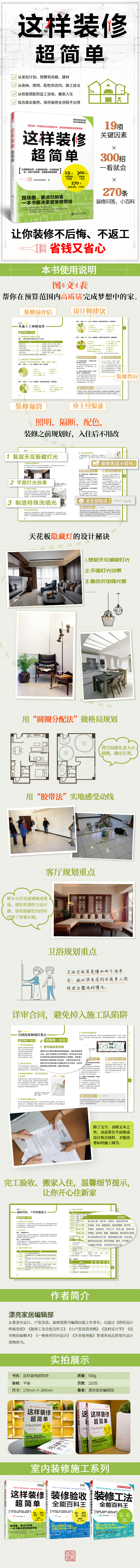 書中歸納出裝修前評估、裝修預(yù)算、設(shè)計(jì)圖構(gòu)思、空間配置、建材運(yùn)用、柜體收納、室內(nèi)隔斷、空間照明、空間配色、工程法規(guī)、尋找施工隊(duì)、了解行情、裝修時(shí)間、檢查合同、基礎(chǔ)工程、設(shè)備工程、裝飾工程、軟裝選搭、完工驗(yàn)收、搬家入住等 20 項(xiàng)裝修關(guān)鍵內(nèi)容。