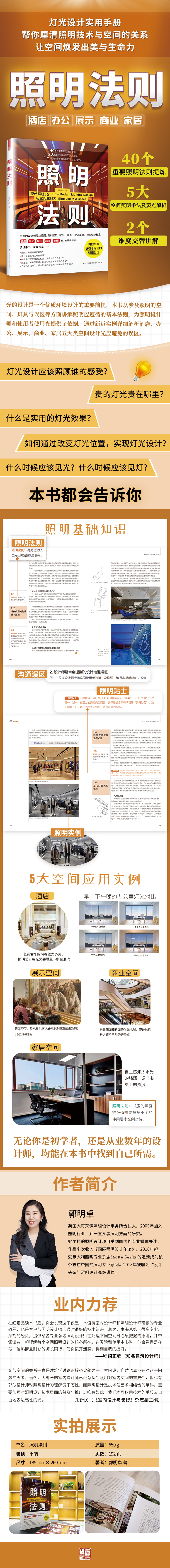 全書從涉及照明的空間、燈具與誤區(qū)全面介紹了照明應(yīng)遵循的基本法則,是室內(nèi)設(shè)計(jì)師、燈光設(shè)計(jì)師、有需求的業(yè)主都可以從中得到啟發(fā)與靈感的教科書。