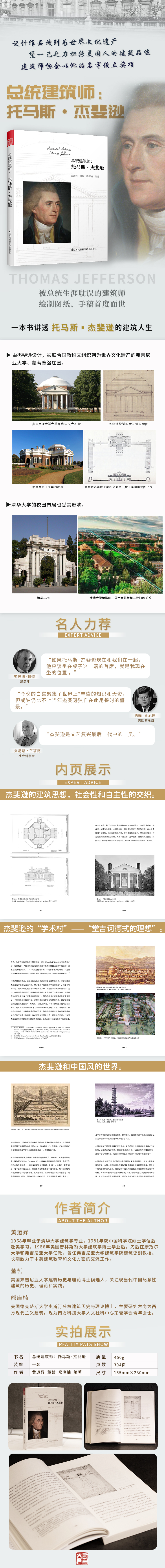 該書(shū)由弗吉尼亞大學(xué)建筑學(xué)院黃運(yùn)昇教授倡議并編寫(xiě),盡可能用平實(shí)的材料和親切的語(yǔ)言讓更多人走近杰弗遜的建筑遺產(chǎn)。除蒙蒂塞洛、白楊林莊園、弗吉尼亞大學(xué)、弗吉尼亞州議會(huì)大樓幾處專題之外,各章均把杰弗遜的建筑貢獻(xiàn)放在更廣的維度里去考察,有時(shí)或許會(huì)從多個(gè)角度討論同一對(duì)象。書(shū)中還引用了大量英文的參考文獻(xiàn),并盡量提供原文對(duì)照,方便讀者學(xué)習(xí)參考。