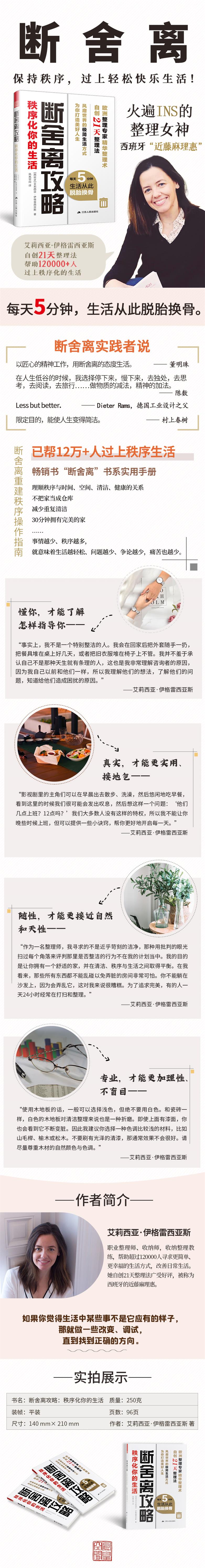 讓天生愛干凈的人做好整理不難,難的是讓天生沒有整理細(xì)胞的人生活得有規(guī)律、有秩序。本書作者艾莉西亞?伊格雷西亞斯坦言自己就是一個(gè)進(jìn)了家門就隨手丟外套的人,怎么樣,是不是感覺一下子拉近了和作者的距離?但是作者如今成為了一位著名整理師,還獨(dú)創(chuàng)了一套21天整理法,這個(gè)故事是不是很勵(lì)志?