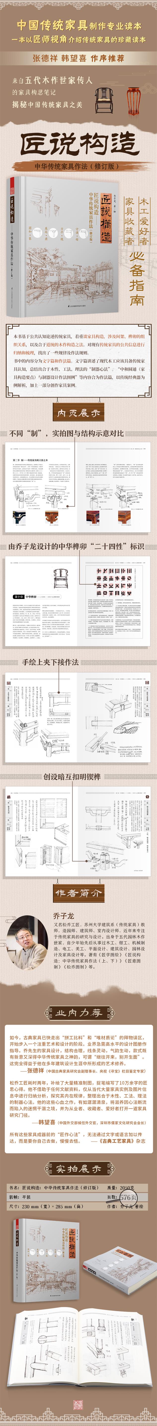 《匠說(shuō)構(gòu)造——中華傳統(tǒng)家具作法(修訂版)》是作者集二十多年的思考與研究,這本書從家具的構(gòu)造出發(fā),從中探究其規(guī)律與原理,為建立現(xiàn)代中國(guó)家具學(xué)體系提供構(gòu)架性建議。現(xiàn)今有關(guān)于家具的著作基本上是對(duì)成器家具的圖賞或文學(xué)點(diǎn)評(píng),少有對(duì)家具成器前的作法介紹,偶有幾本關(guān)于制作的,但也不夠系統(tǒng),不夠深入。留存至今的傳統(tǒng)家具的測(cè)繪、辨識(shí)、鑒賞、技術(shù)法則及匠工術(shù)語(yǔ),甚至有關(guān)于型制、制式、款式等這些專業(yè)詞匯,更是讓人云里霧里,似懂非懂。而《匠說(shuō)構(gòu)造》這本書對(duì)以上疑問(wèn)逐一作了詳細(xì)的解答。