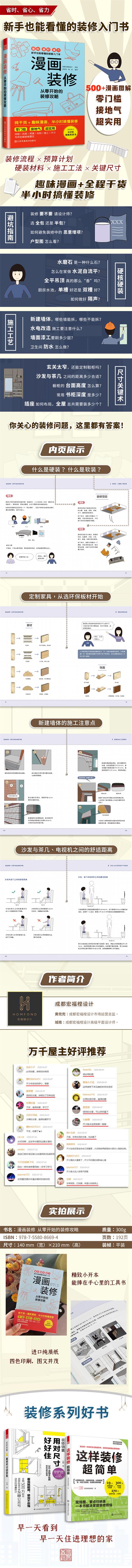 本書精準(zhǔn)聚焦國內(nèi)年輕人關(guān)心、關(guān)注的裝修熱門問題,以漫畫的形式將枯燥、煩瑣的裝修知識形象化、可視化,降低理解門檻,讓裝修變輕松。全書分四大章,第1章為裝修前,你需要了解的事,“知己知彼”,有的放矢,裝修才能變簡單;第2章是硬裝的硬核指南,重點聚焦硬裝(墻面、地面、吊頂)、空間改良等裝修難題;第3章為重要的施工注意事項,包括墻體改造、水電改造、防水施工等過程中需要避坑的關(guān)鍵點;第4章是符合人體工程學(xué)的尺寸關(guān)鍵術(shù),清晰直觀地掌握家裝中的常用尺寸。
